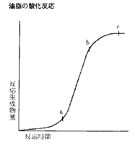 まず、油脂の酸化の反応初期においては、酸素の吸収はあまり認められずa点までは反応速度が非常に小さい。このa点までの期間を誘導期間と呼んでいる。しばらくすると酸素の吸収が烈しくなりb点までは対数的に促進する。それからb点を超えると基質濃度の低下と反応性の蓄積などにより、酸化の速度は次第に遅くなり、c点で反応は停止する。この反応生成物にはアルデヒド、アルコール、カルボン酸などがあり、これらが不快な変敗臭の原因物質となっている。