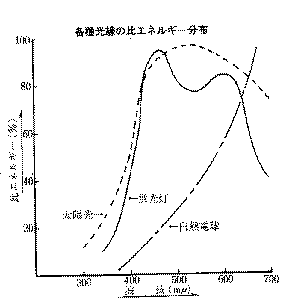 太陽光線はいろいろな波長の光の集まりである。一般に、紫外線のように、波長が短い光ほどエネルギーが大きく、強く酸化を促進する。可視光線も光量がありエネルギーも比較的大きいので、十分に酸化を促進する。各種光源の波長分布を次の図に示した。