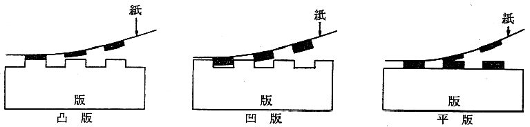最新の印刷技術ではあてはまらない場合もあるが、一般には同じ印刷物を大量に作るためには版が必要である。版の形状で分類すると凸版、凹版、平版の3つが代表的である。その原理図を図1に示した。このほか孔版があり、これも加えて4版式ということもある。