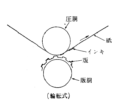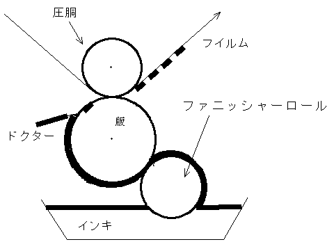 図1および図6に示したように、グラビア輪転印刷では、シリンダー状の版に小さな穴(くぼみ)があいており、ファニッシャーロールについたインキが版全面に移り、穴のない部分(非印刷部分)のインキはドクターで掻き落とされ、穴に残ったインキが圧胴で押さえられてフイルムに転写する。この方式は高速印刷で大量の印刷物製造に適している。