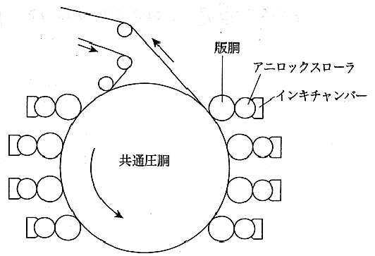 ーの大きなシリンダーが印刷版、その上に圧胴(ガイドローラに隠れている)がある。ファ