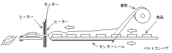 よこピロー包装機の種類 ▼正ピローと逆ピロータイプ 一般には、図2のように、上部の巻取からフイルムが供給され、食品が乗ったコンベアを上から包むように背中シールをし、筒の中に等間隔の食品が並んだ状態で前に進みエンドシールとカットが同時に行われる。これが図2の正ピロー(ボトムシーム)である。これに対してフイルムが下から供給され、背中シールが食品より上部でシールする方式が逆ピロー(トップシーム)タイプ(図3)である。
